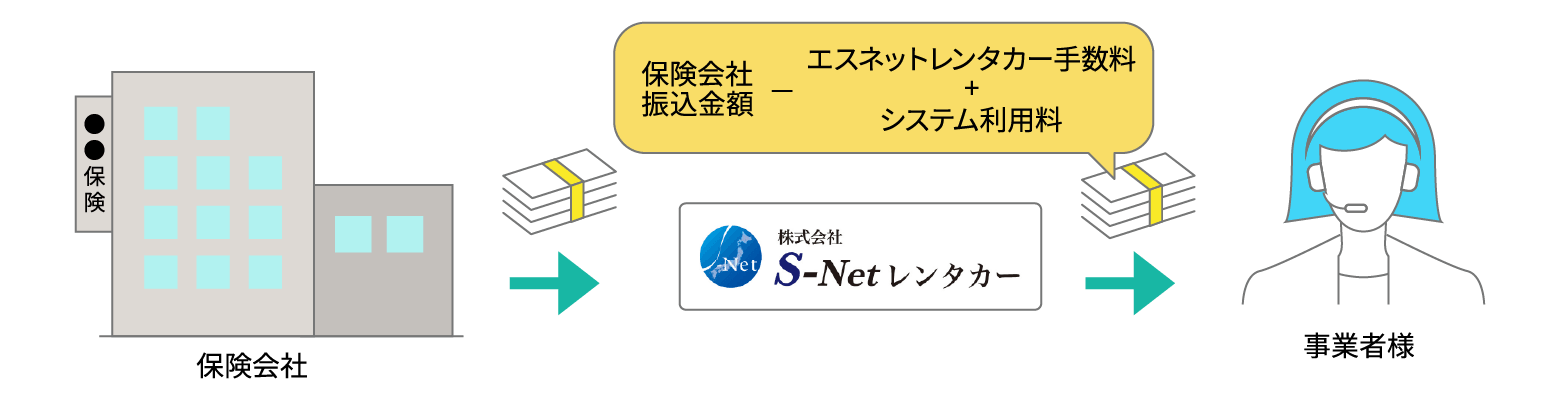 保険会社様からの入金を確認後、「エスネットレンタカー手数料+システム利用料」を差し引いた金額を振り込ませていただきます。